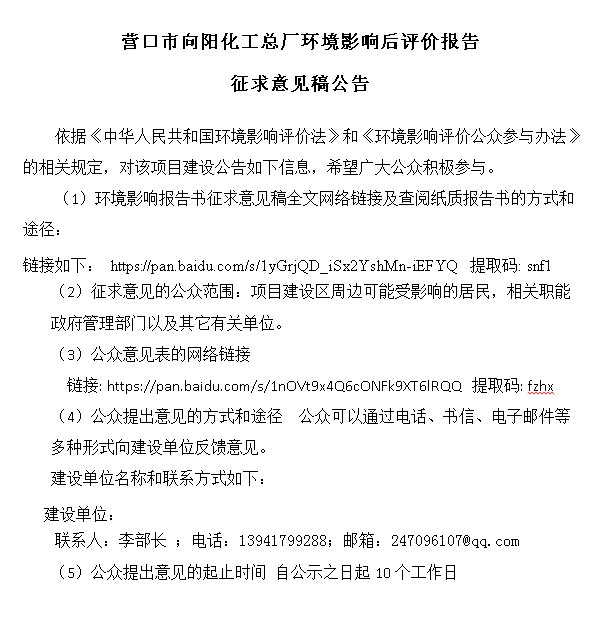 營口市向陽化工總廠環境影響后評價報告 征求意見稿公告