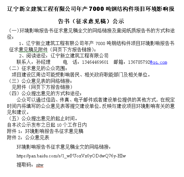遼寧新立建筑工程有限公司年產7000噸鋼結構件項目環境影響報告書(征求意見稿)公示