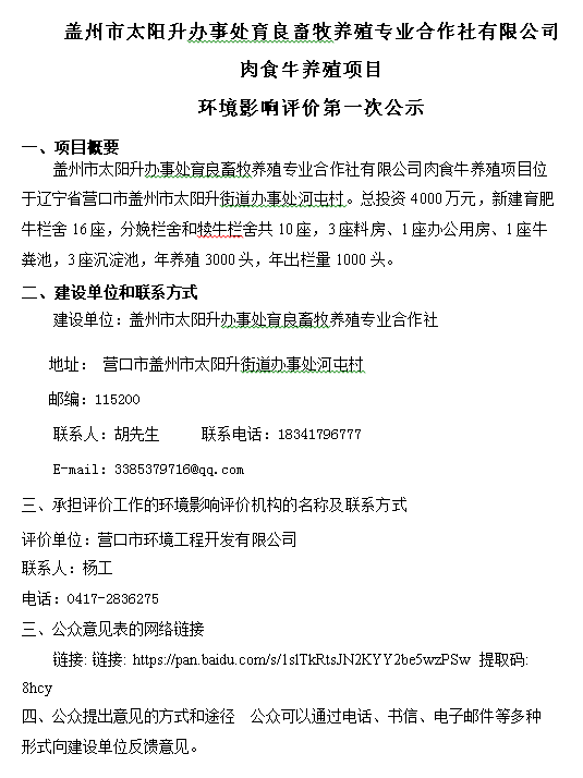 蓋州市太陽升辦事處育良畜牧養殖專業合作社有限公司 肉食牛養殖項目 環境影響評價第一次公示